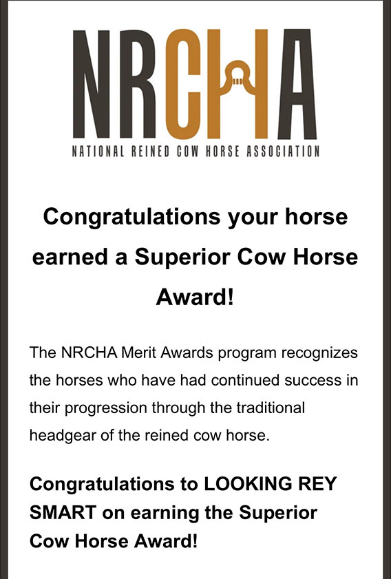 The first foal out of our good mare Reygiddy Ann (Dual Smart Rey x Cee N Stars by Grays Starlight), bred and raised here on the ranch competed as a Snaffle Bit Cow Horse in 2025 and in one year of competition Looking Rey Smart earned both the NRCHA Certificate of Ability and Superior Cow Horse Award.